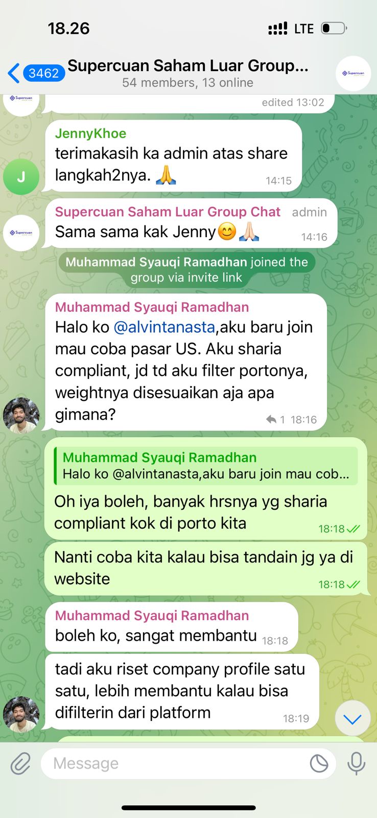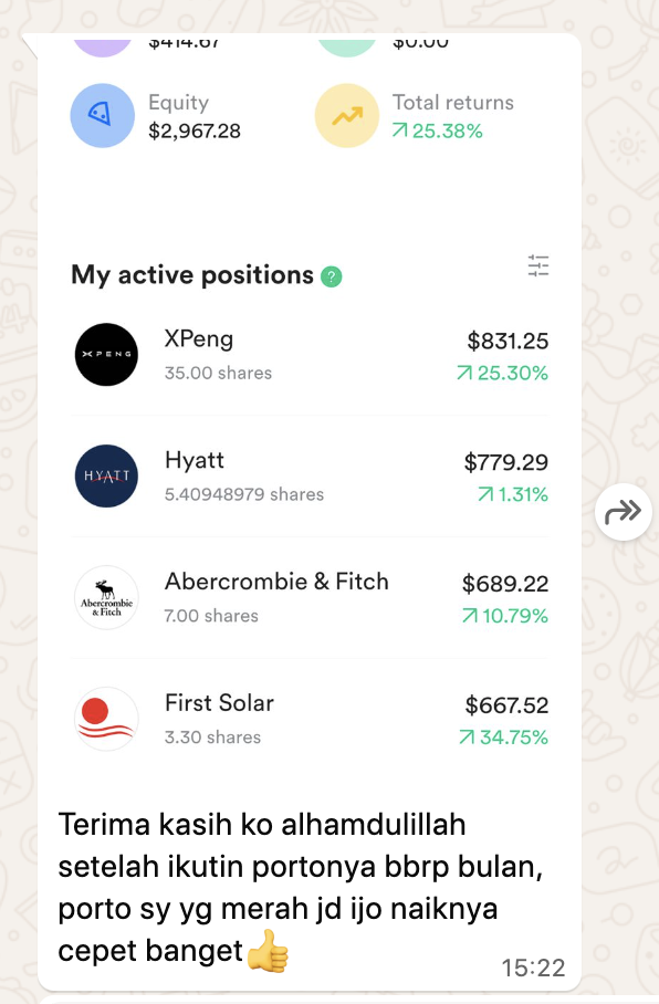 Sudah jadi member Supercuan Saham Luar sejak lama selain juga gabung di saham indonya. Returnnya sih malah lebih bagus dari saham indonya, dan secara pemilihan sahamnya juga ga kaleng-kaleng, sampe bisa konsisten beat s&p500, mantap pokoknya, highly recommended!